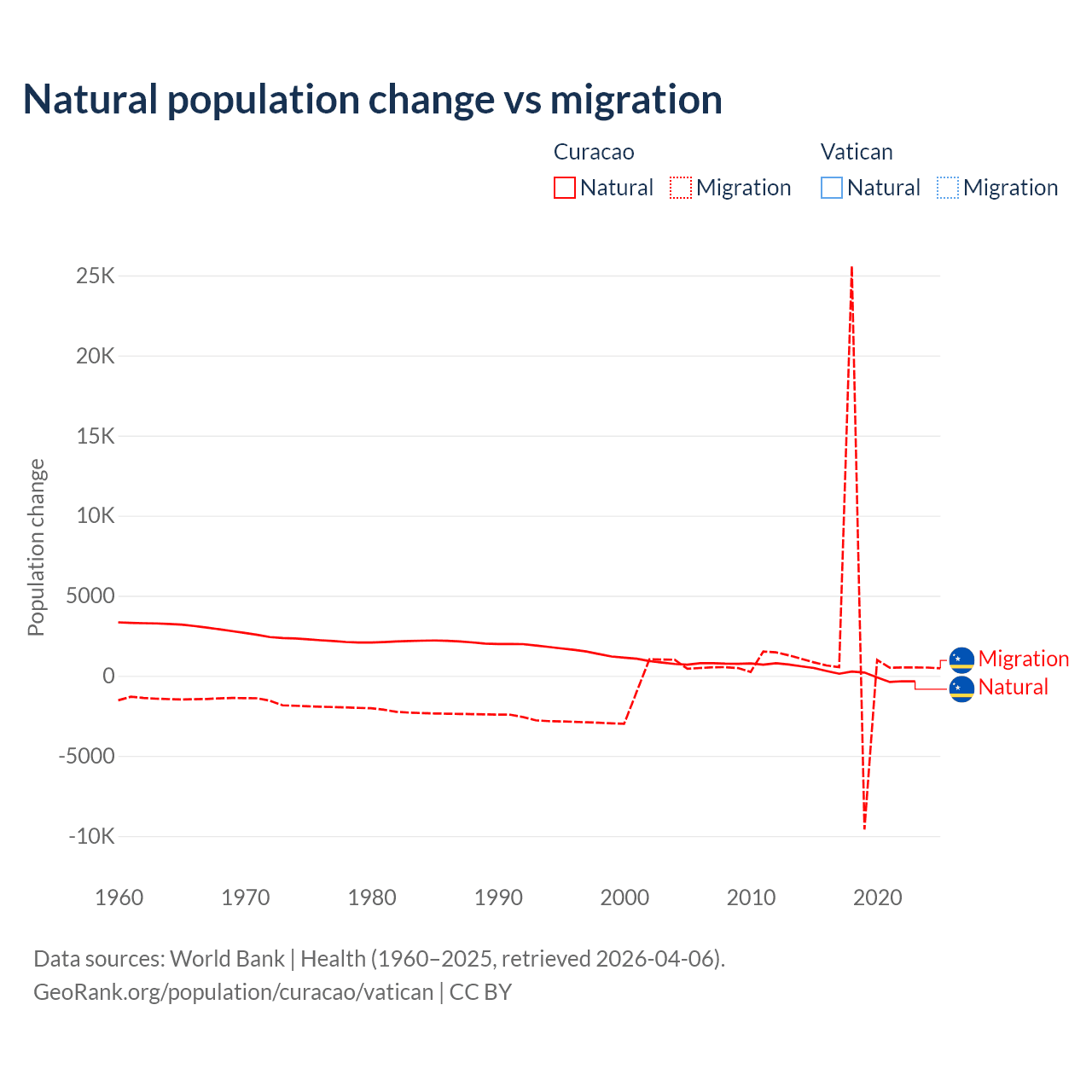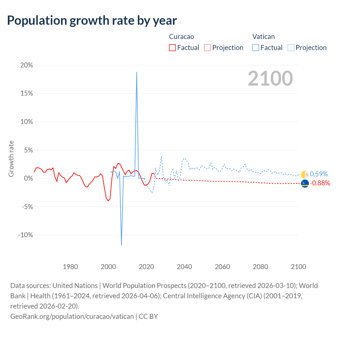 - For the last 10 years, Curacao has had an average growth rate of +0.13% per year vs +1.9% in the Vatican.