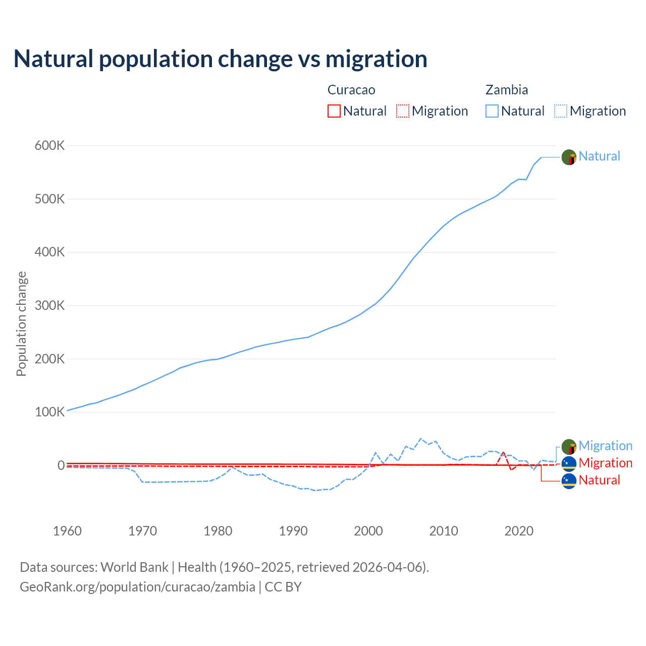 Over the last 10 years, 3.72% of the population change in Curacao is from natural causes (a gain of 834 people) and 96.3% is from migration (a gain of 21,615 people). In Zambia 97.4% is from natural causes (a gain of 5,233,797 people) and 2.58% is from migration (a gain of 138,554 people).