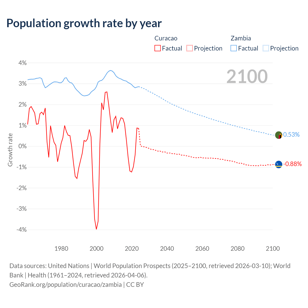 - For the last 10 years, Curacao has had an average growth rate of +0.13% per year vs +3% in Zambia.