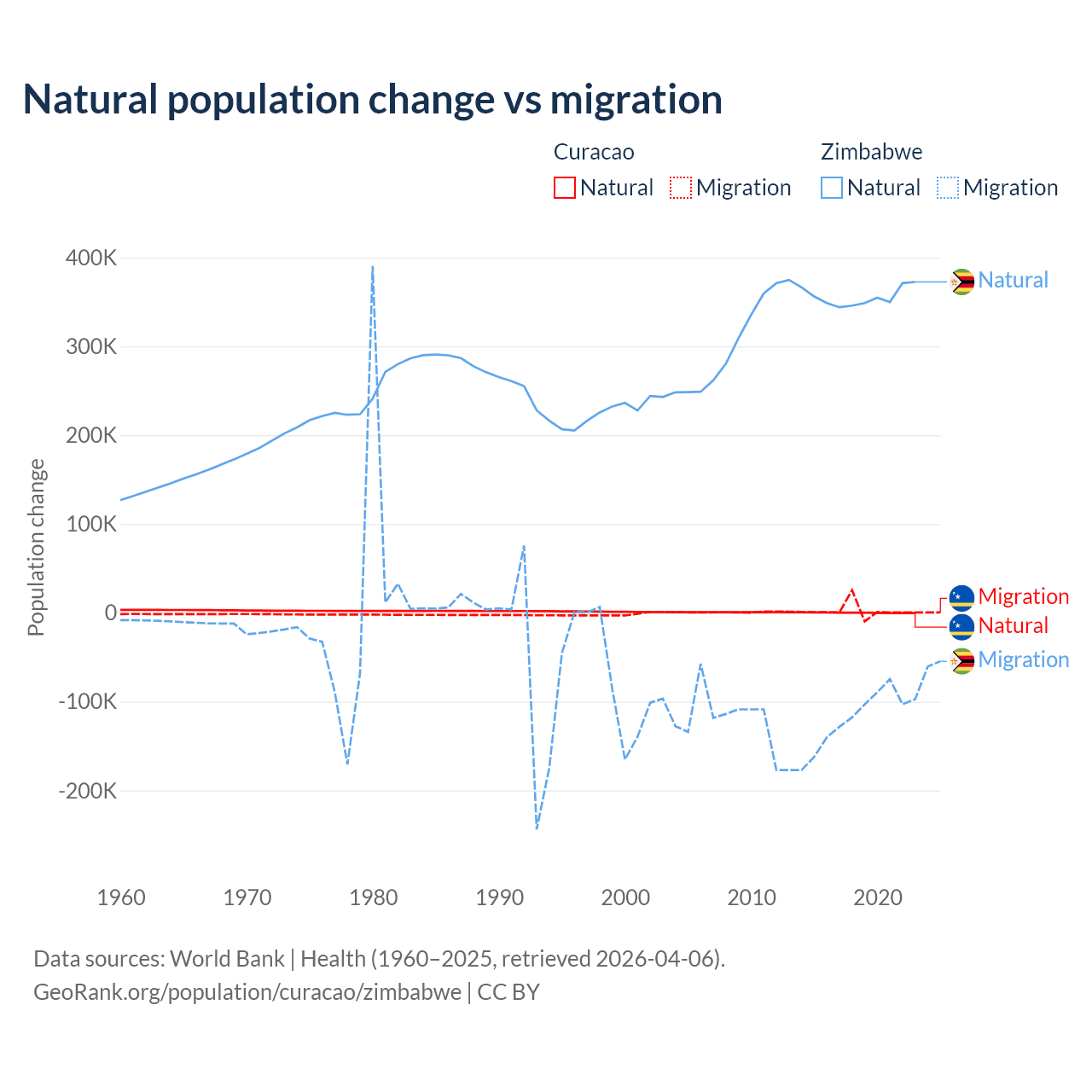 Over the last 10 years, 3.72% of the population change in Curacao is from natural causes (a gain of 834 people) and 96.3% is from migration (a gain of 21,615 people). In Zimbabwe 74.9% is from natural causes (a gain of 3,558,487 people) and 25.1% is from migration (a loss of 1,192,807 people).
