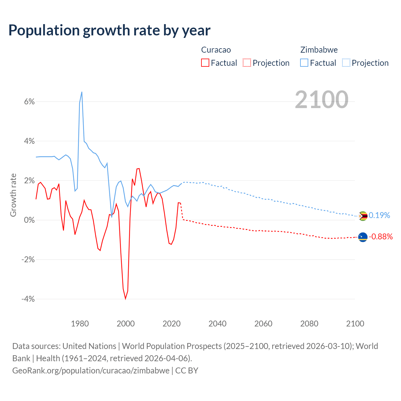 - For the last 10 years, Curacao has had an average growth rate of +0.13% per year vs +1.57% in Zimbabwe.