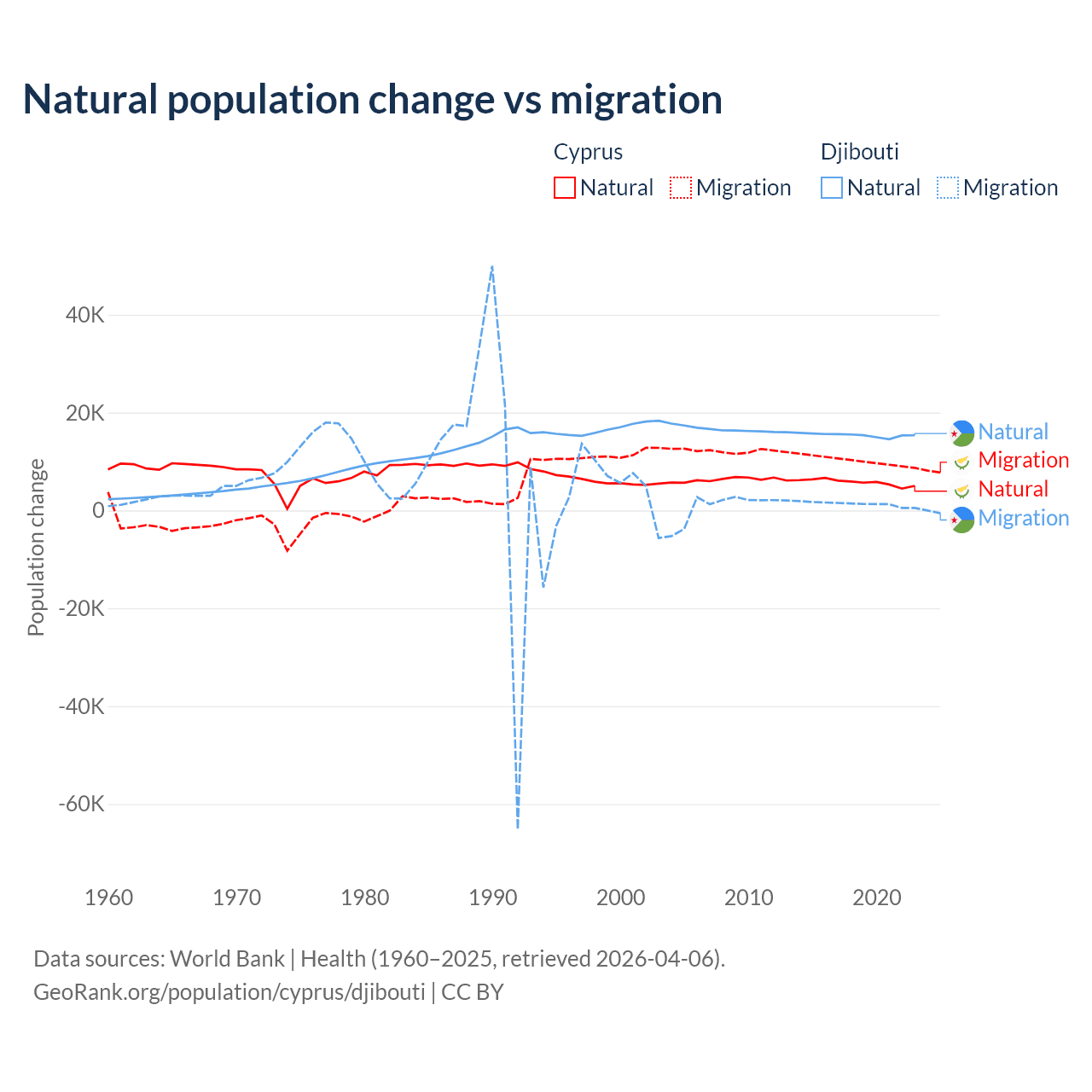 Over the last 10 years, 36.2% of the population change in Cyprus is from natural causes (a gain of 57,464 people) and 63.8% is from migration (a gain of 101,458 people). In Djibouti 92.1% is from natural causes (a gain of 153,892 people) and 7.87% is from migration (a gain of 13,138 people).