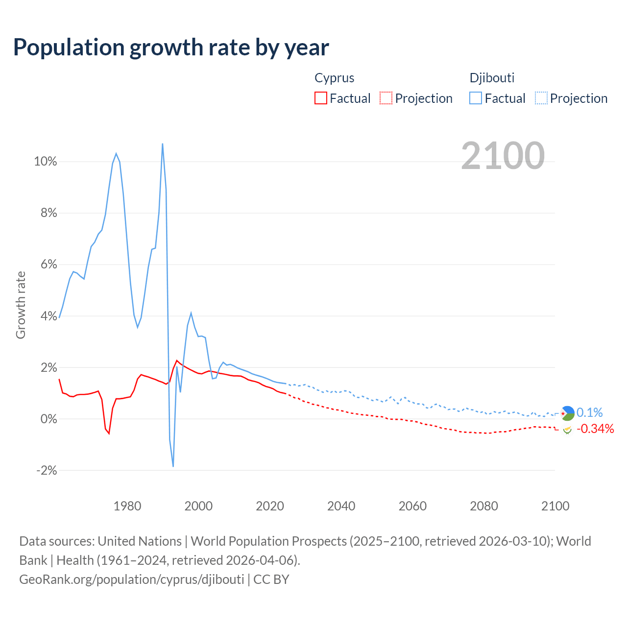 - For the last 10 years, Cyprus has had an average growth rate of +1.26% per year vs +1.57% in Djibouti.