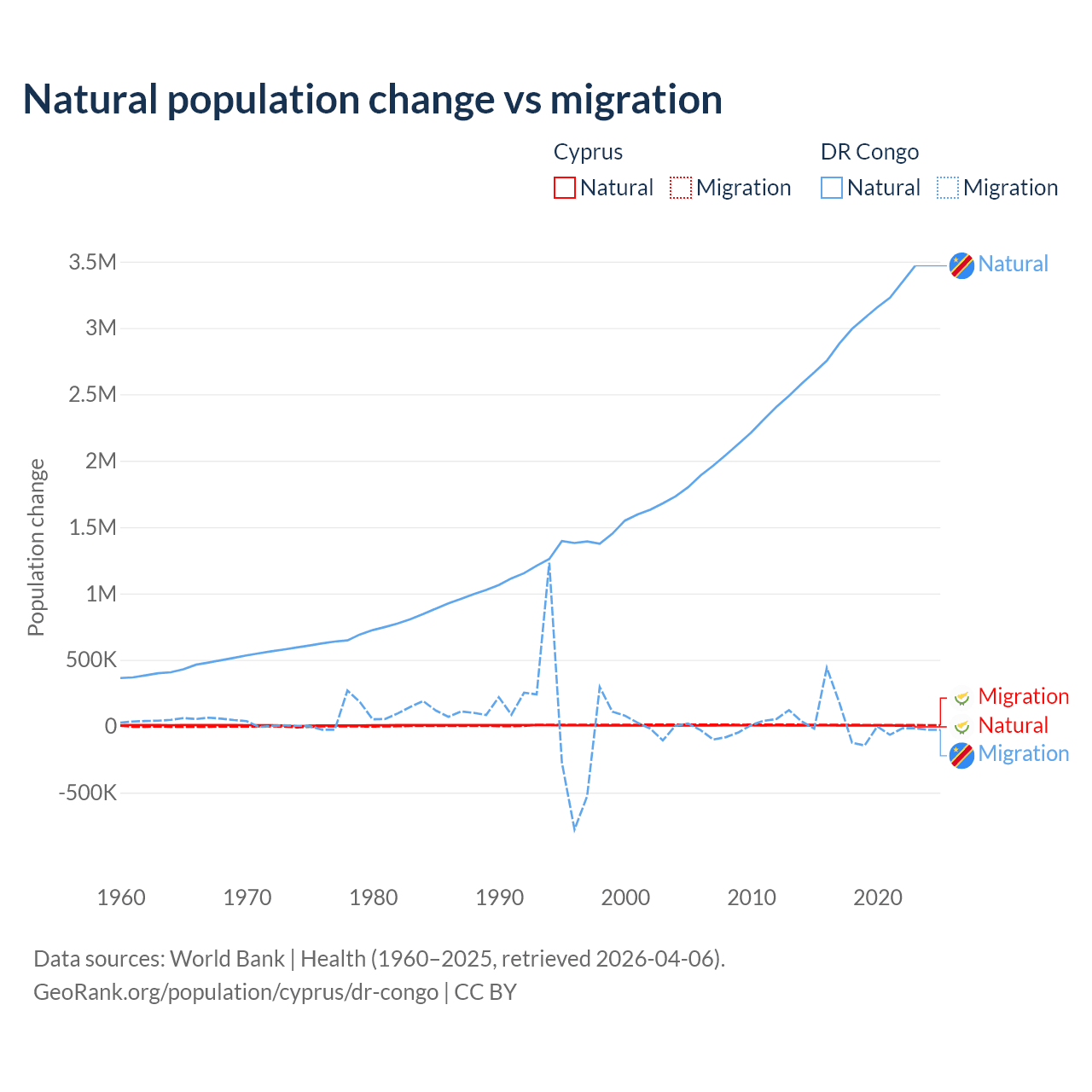 Over the last 10 years, 36.2% of the population change in Cyprus is from natural causes (a gain of 57,464 people) and 63.8% is from migration (a gain of 101,458 people). In the DR Congo 99.1% is from natural causes (a gain of 30,150,516 people) and 0.89% is from migration (a gain of 270,872 people).