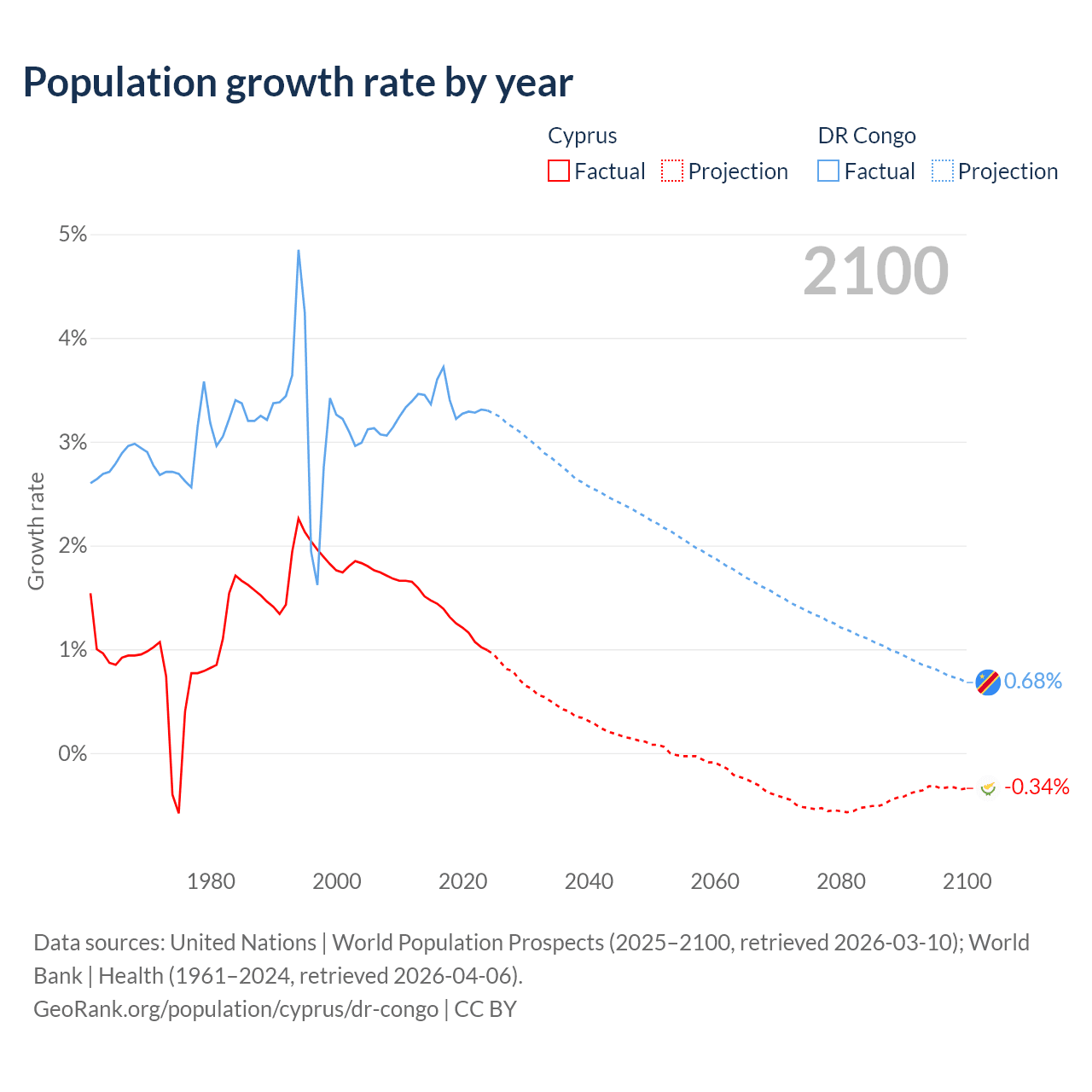 - For the last 10 years, Cyprus has had an average growth rate of +1.26% per year vs +3.38% in the DR Congo.