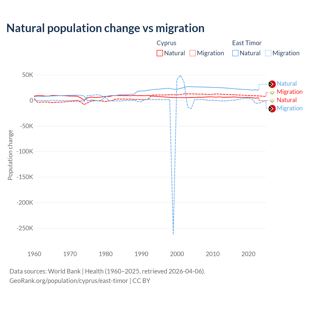 Over the last 10 years, 36.2% of the population change in Cyprus is from natural causes (a gain of 57,464 people) and 63.8% is from migration (a gain of 101,458 people). In East Timor 98.3% is from natural causes (a gain of 217,698 people) and 1.66% is from migration (a gain of 3,665 people).