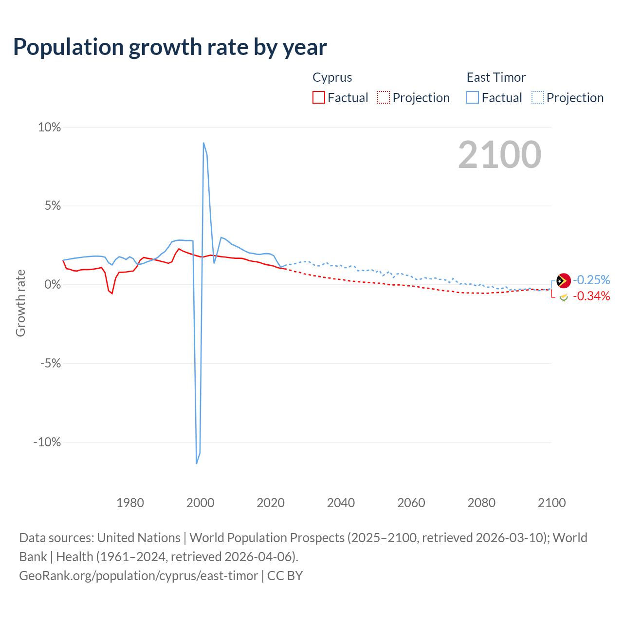 - For the last 10 years, Cyprus has had an average growth rate of +1.26% per year vs +1.74% in East Timor.