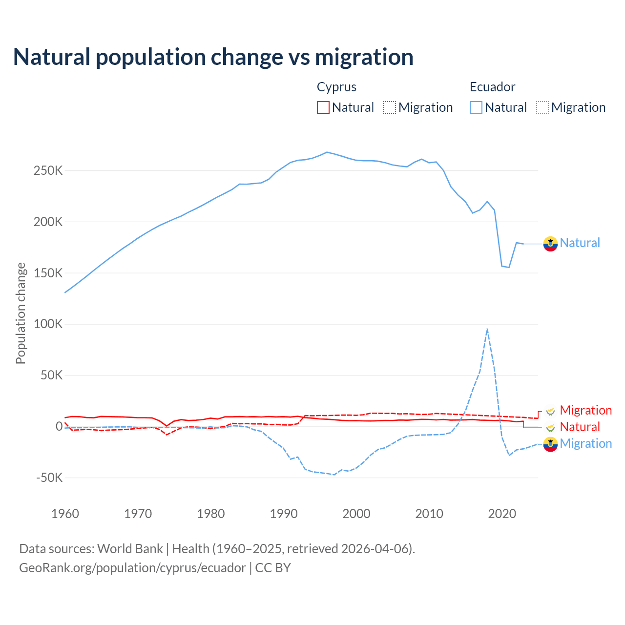 Over the last 10 years, 36.2% of the population change in Cyprus is from natural causes (a gain of 57,464 people) and 63.8% is from migration (a gain of 101,458 people). In Ecuador 91.9% is from natural causes (a gain of 1,964,352 people) and 8.08% is from migration (a gain of 172,707 people).
