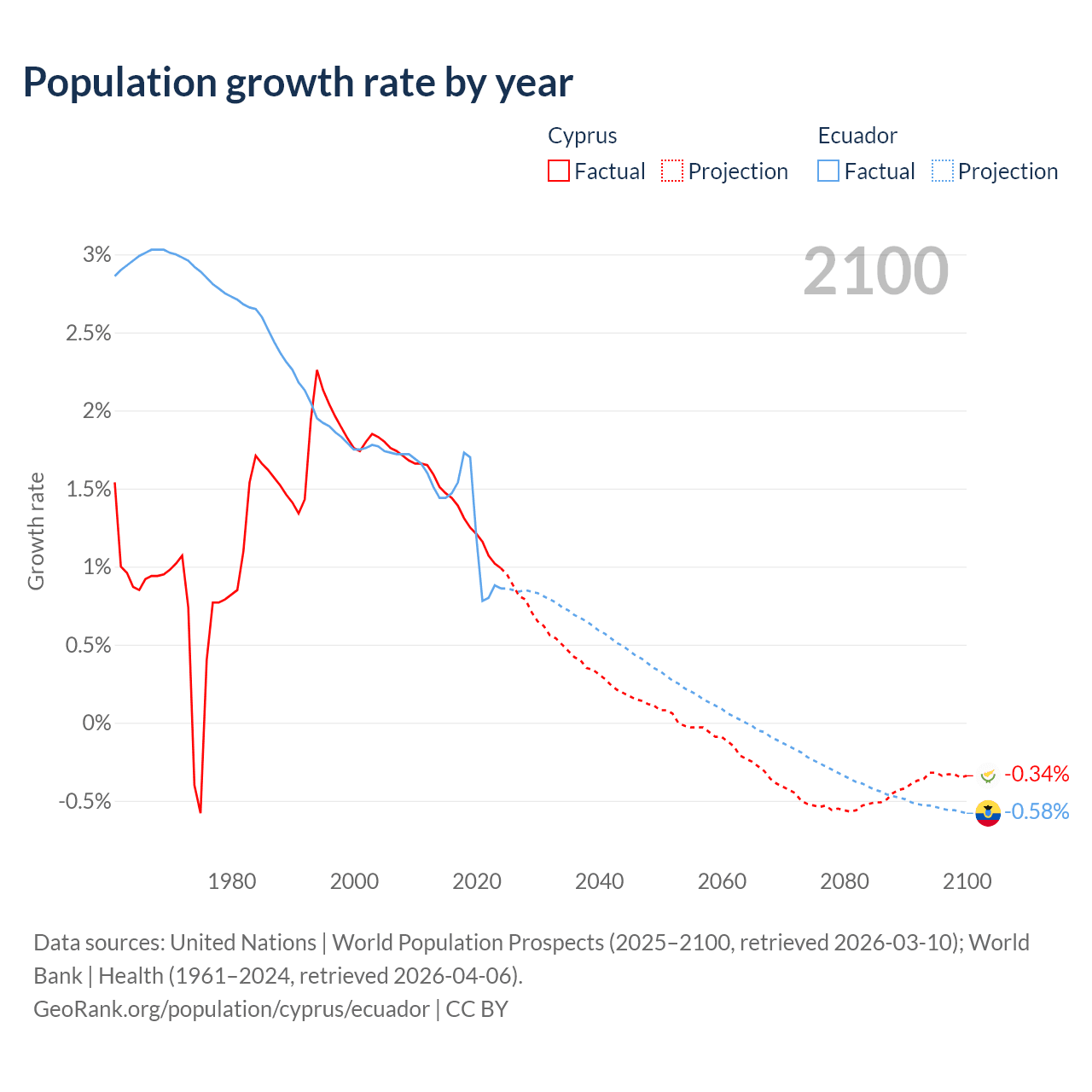 - For the last 10 years, Cyprus has had an average growth rate of +1.26% per year vs +1.26% in Ecuador.