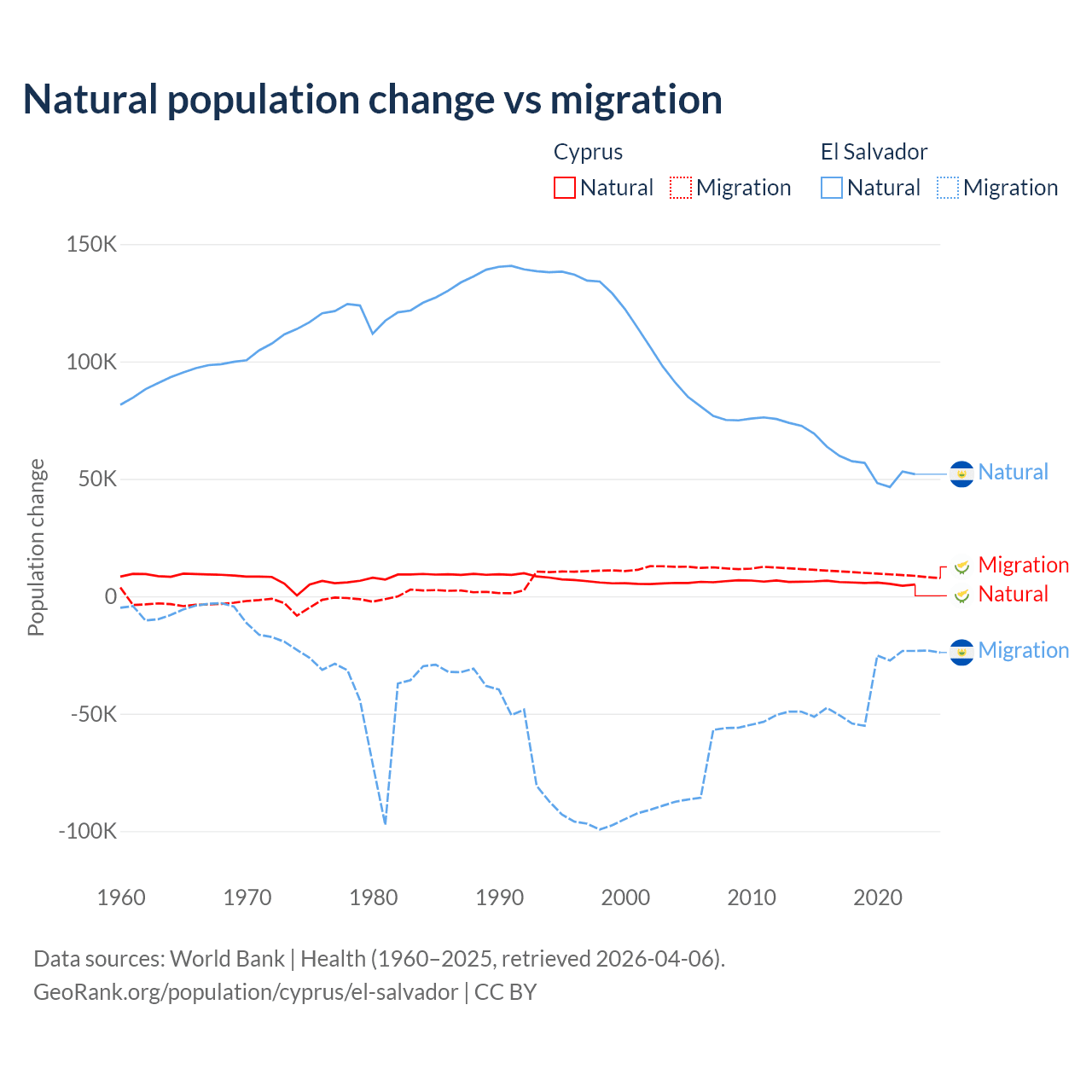 Over the last 10 years, 36.2% of the population change in Cyprus is from natural causes (a gain of 57,464 people) and 63.8% is from migration (a gain of 101,458 people). In El Salvador 58.8% is from natural causes (a gain of 579,641 people) and 41.2% is from migration (a loss of 406,874 people).
