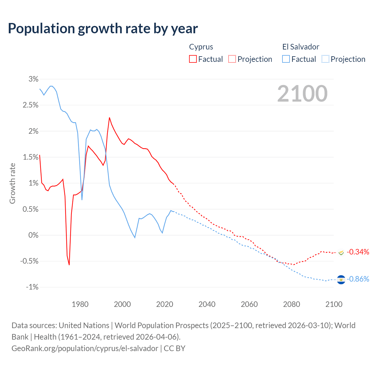 - For the last 10 years, Cyprus has had an average growth rate of +1.26% per year vs +0.29% in El Salvador.