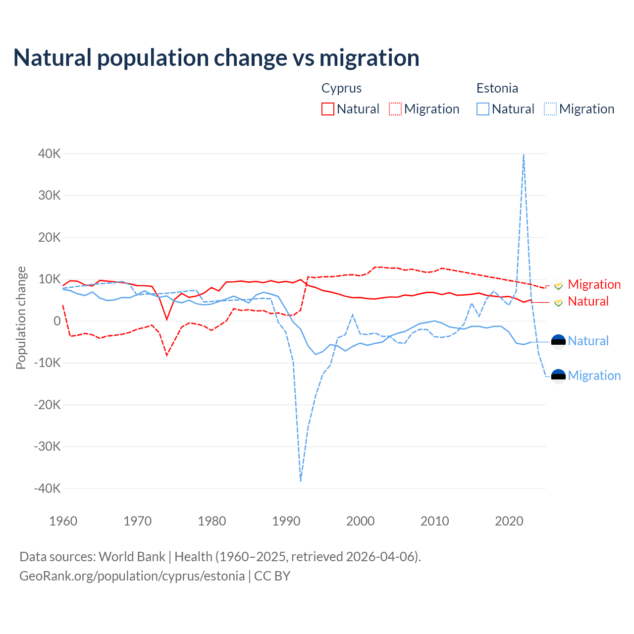 Over the last 10 years, 36.2% of the population change in Cyprus is from natural causes (a gain of 57,464 people) and 63.8% is from migration (a gain of 101,458 people). In Estonia 26.1% is from natural causes (a loss of 27,683 people) and 73.9% is from migration (a gain of 78,553 people).