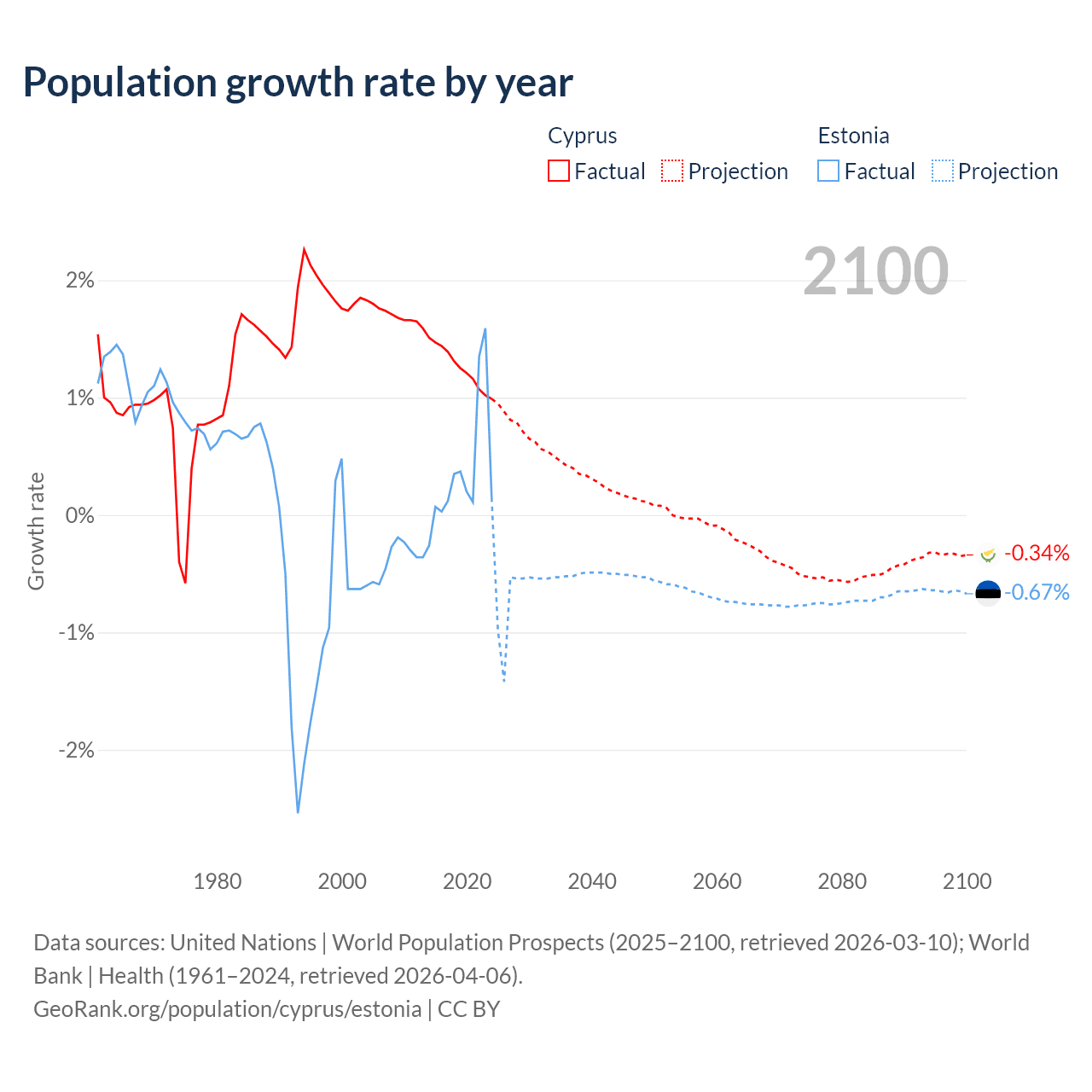- For the last 10 years, Cyprus has had an average growth rate of +1.26% per year vs +0.37% in Estonia.