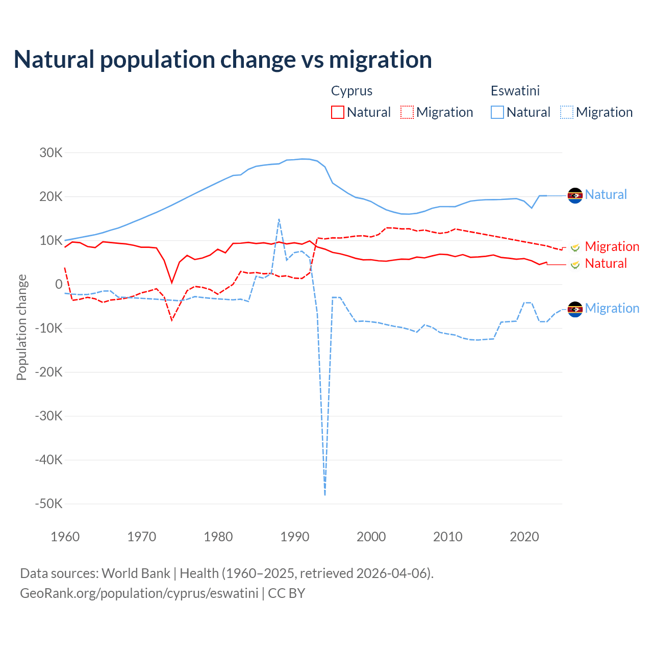 Over the last 10 years, 36.2% of the population change in Cyprus is from natural causes (a gain of 57,464 people) and 63.8% is from migration (a gain of 101,458 people). In Eswatini 68.3% is from natural causes (a gain of 192,206 people) and 31.7% is from migration (a loss of 89,012 people).