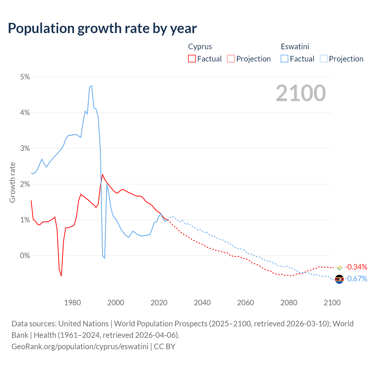 - For the last 10 years, Cyprus has had an average growth rate of +1.26% per year vs +0.87% in Eswatini.