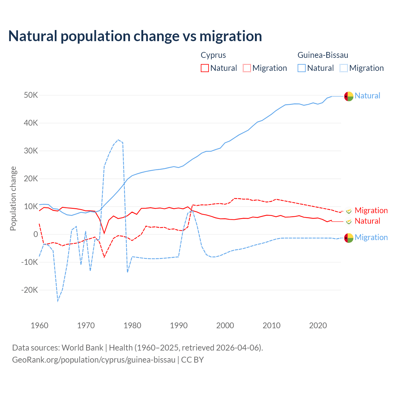 Over the last 10 years, 36.2% of the population change in Cyprus is from natural causes (a gain of 57,464 people) and 63.8% is from migration (a gain of 101,458 people). In Guinea-Bissau 97.1% is from natural causes (a gain of 472,826 people) and 2.87% is from migration (a loss of 13,956 people).