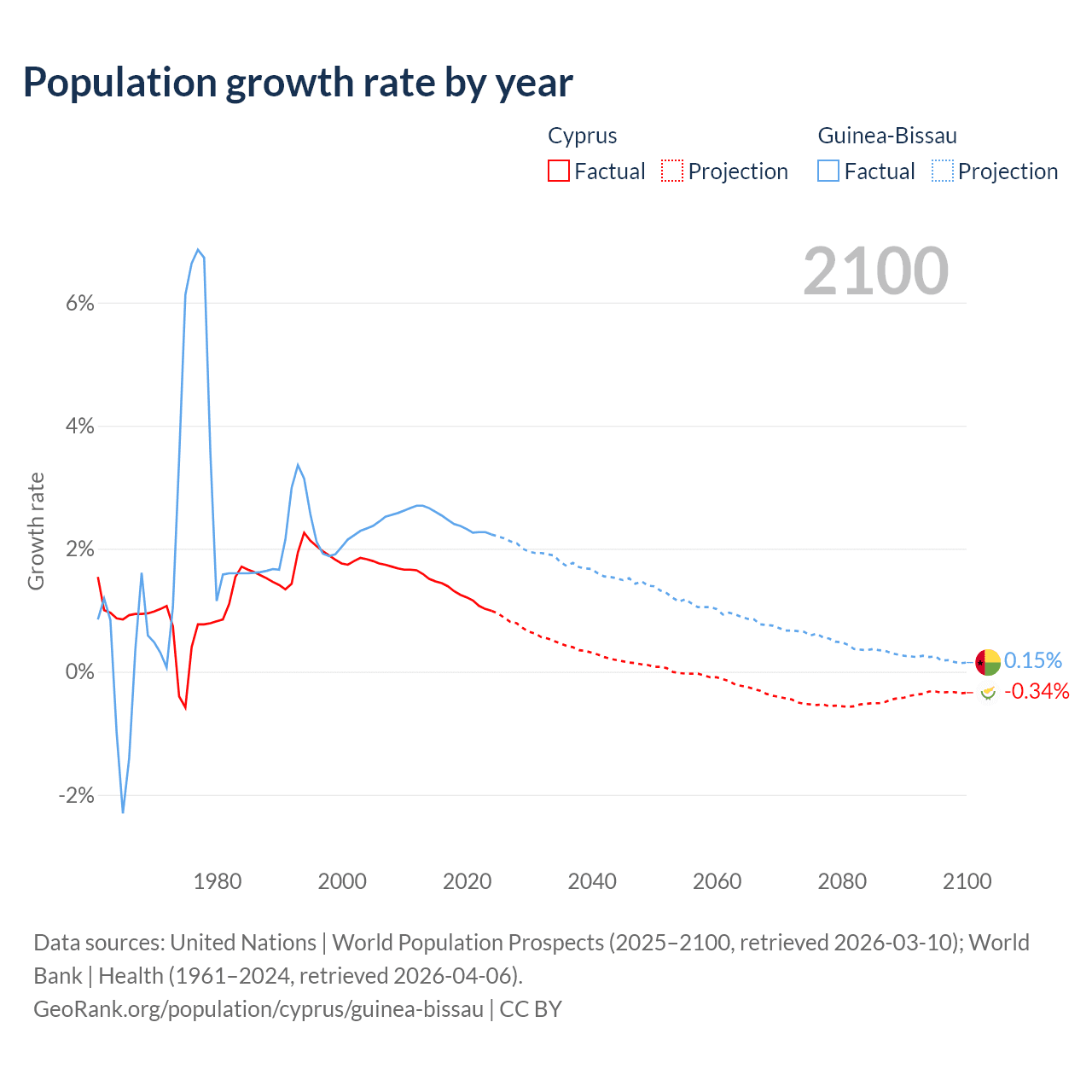 - For the last 10 years, Cyprus has had an average growth rate of +1.26% per year vs +2.4% in Guinea-Bissau.