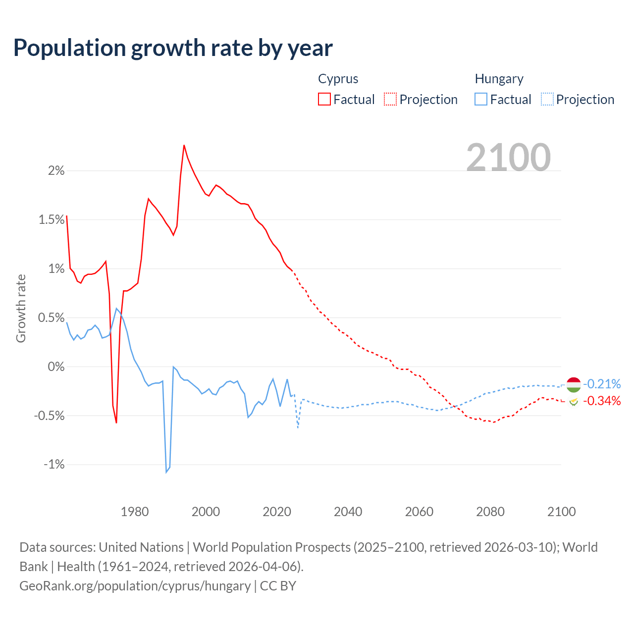 - For the last 10 years, Cyprus has had an average growth rate of +1.26% per year vs -0.29% in Hungary.