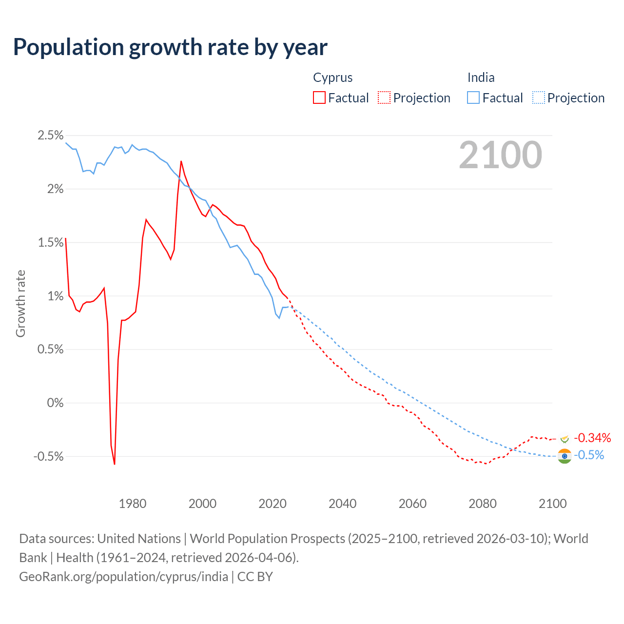 - For the last 10 years, Cyprus has had an average growth rate of +1.26% per year vs +1.03% in India.