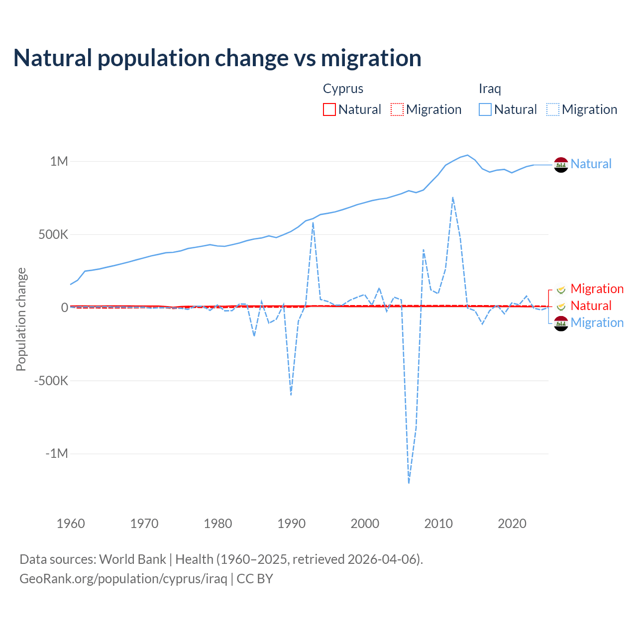 Over the last 10 years, 36.2% of the population change in Cyprus is from natural causes (a gain of 57,464 people) and 63.8% is from migration (a gain of 101,458 people). In Iraq 99.2% is from natural causes (a gain of 9,598,842 people) and 0.76% is from migration (a loss of 73,050 people).