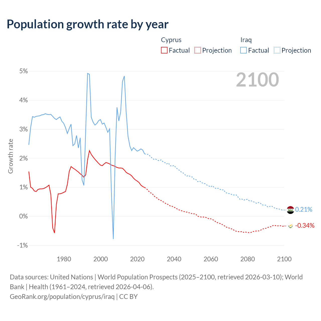 - For the last 10 years, Cyprus has had an average growth rate of +1.26% per year vs +2.45% in Iraq.