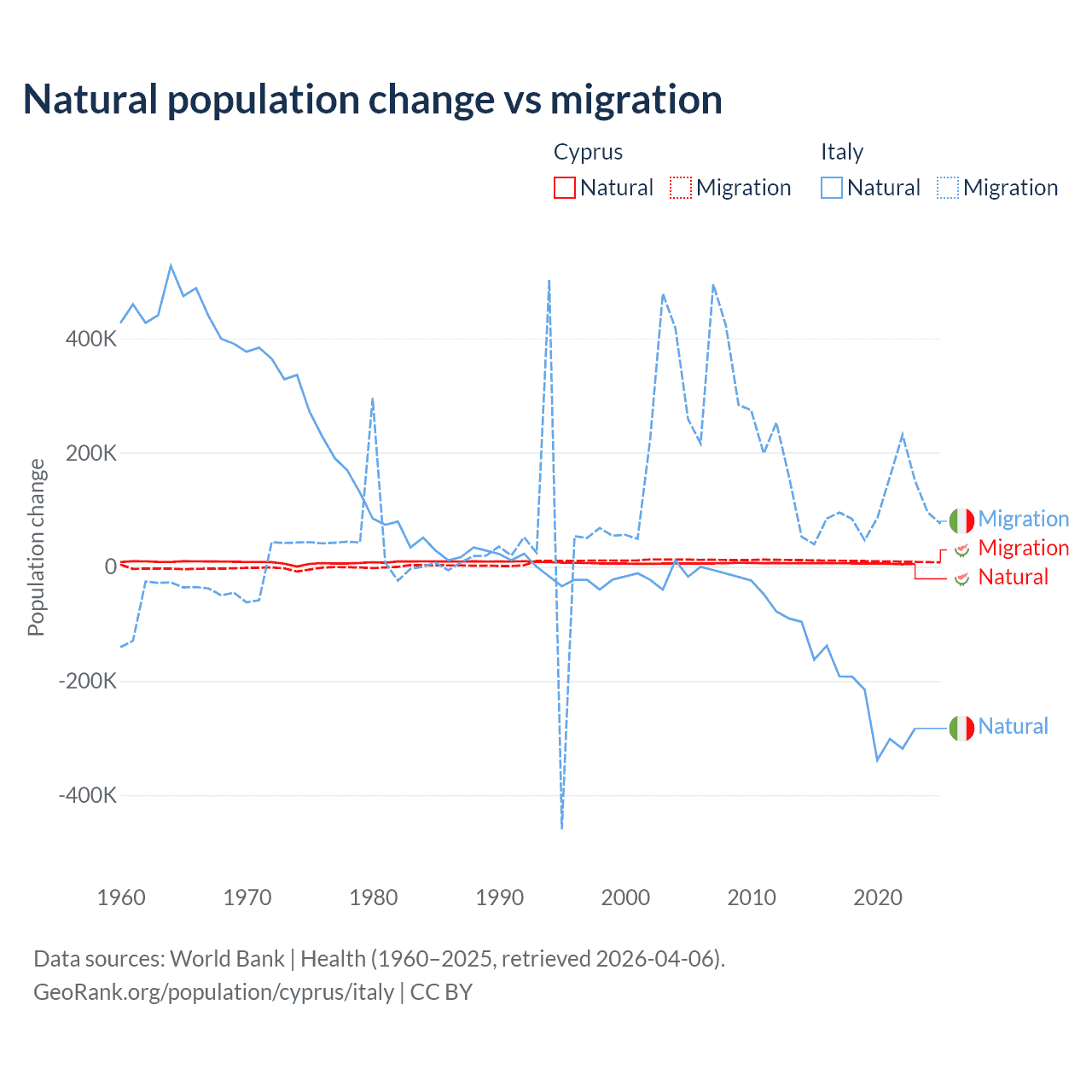 Over the last 10 years, 36.2% of the population change in Cyprus is from natural causes (a gain of 57,464 people) and 63.8% is from migration (a gain of 101,458 people). In Italy 68.6% is from natural causes (a loss of 2,239,084 people) and 31.4% is from migration (a gain of 1,026,128 people).