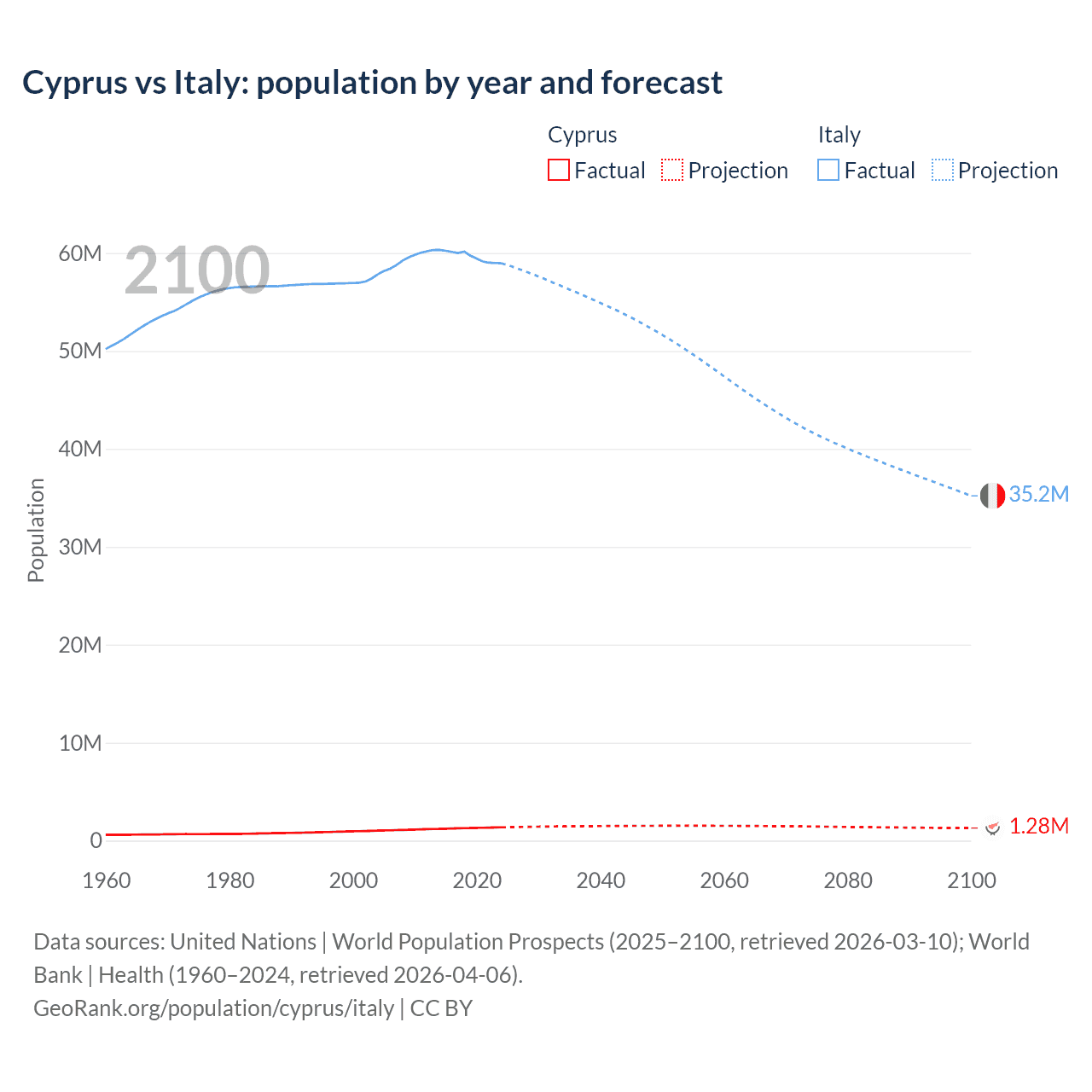The latest officially reported population of Cyprus was 1,358,282 in 2024 vs 58,952,704 people in Italy in 2024. In 2026, based on the adjusted UN estimation, the current Cyprus' population is 1,386,362 people compared to 58,562,681 in Italy.