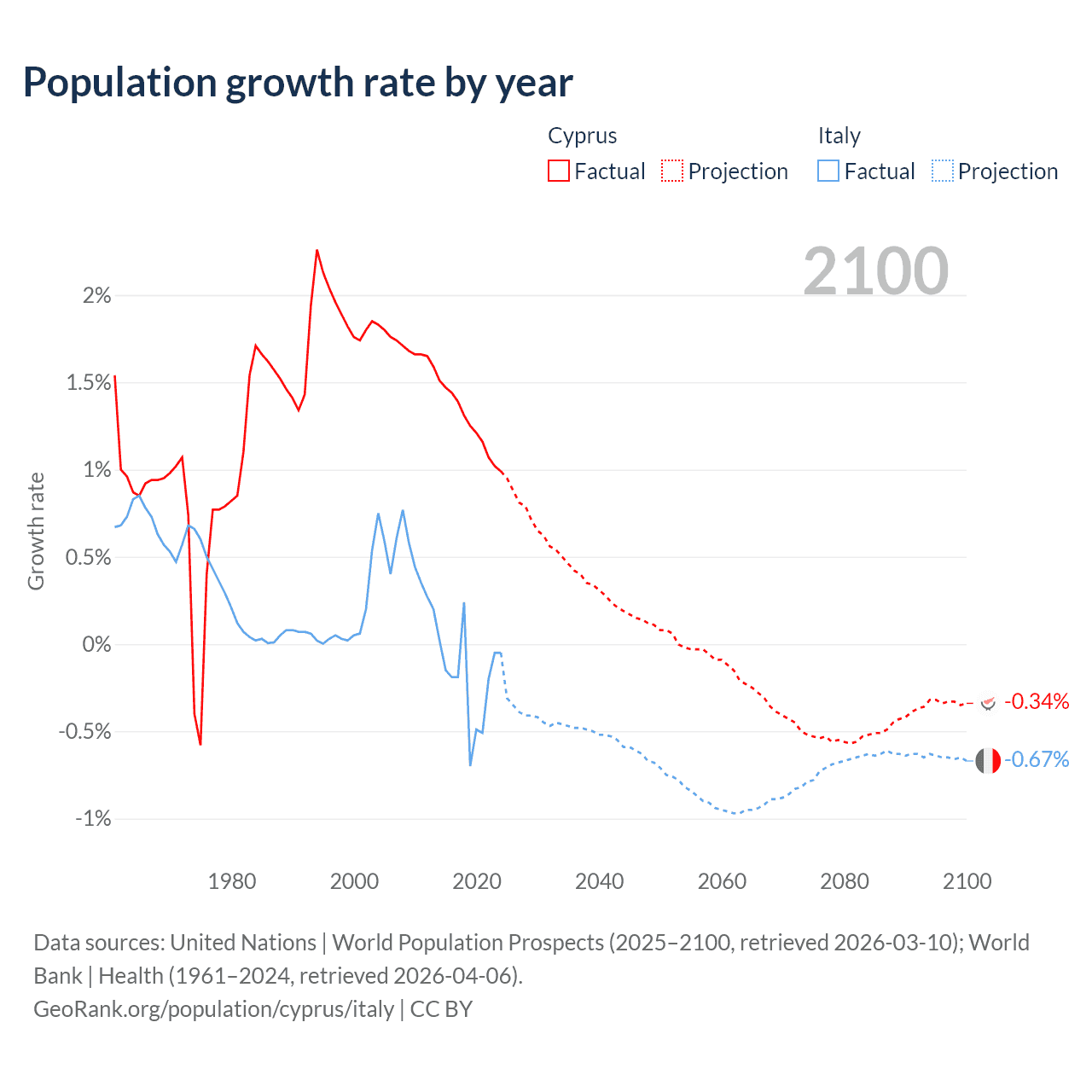 - For the last 10 years, Cyprus has had an average growth rate of +1.26% per year vs -0.21% in Italy.