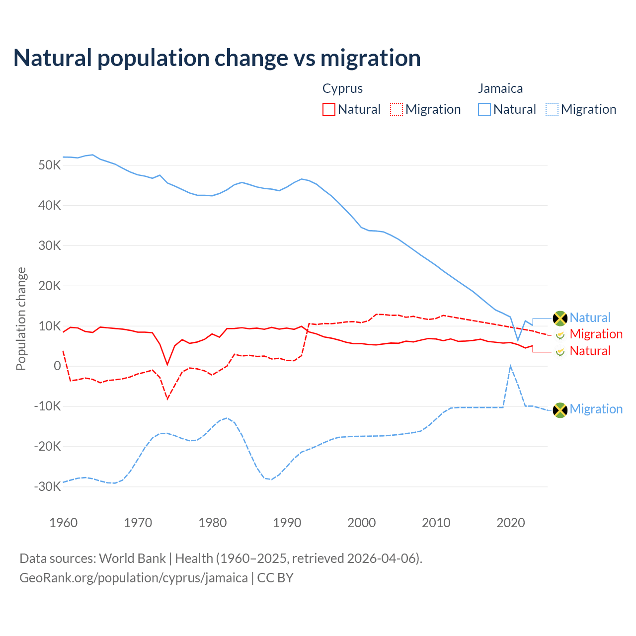 Over the last 10 years, 36.2% of the population change in Cyprus is from natural causes (a gain of 57,464 people) and 63.8% is from migration (a gain of 101,458 people). In Jamaica 61.3% is from natural causes (a gain of 137,465 people) and 38.7% is from migration (a loss of 86,681 people).