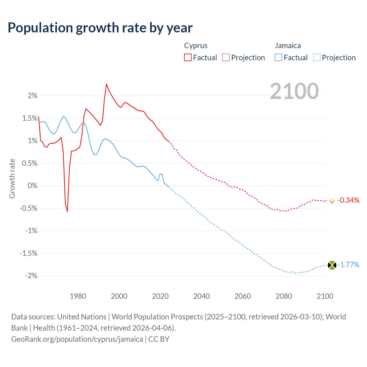 - For the last 10 years, Cyprus has had an average growth rate of +1.26% per year vs +0.18% in Jamaica.