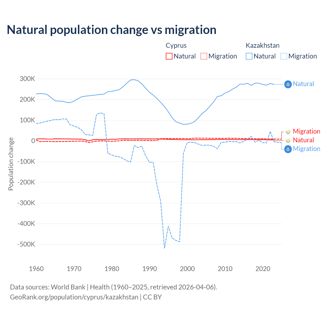 Over the last 10 years, 36.2% of the population change in Cyprus is from natural causes (a gain of 57,464 people) and 63.8% is from migration (a gain of 101,458 people). In Kazakhstan 98.7% is from natural causes (a gain of 2,743,094 people) and 1.33% is from migration (a gain of 36,908 people).