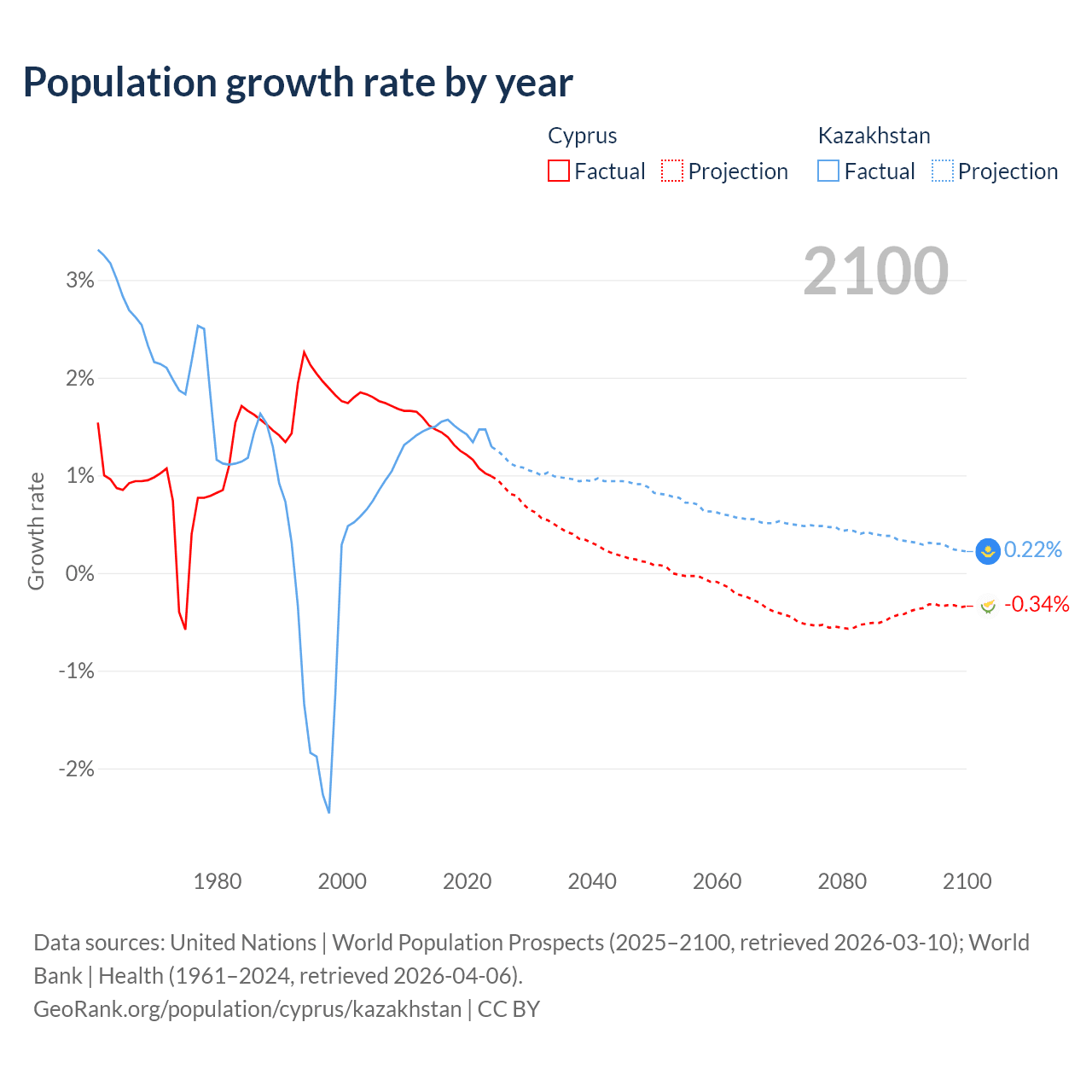 - For the last 10 years, Cyprus has had an average growth rate of +1.26% per year vs +1.46% in Kazakhstan.