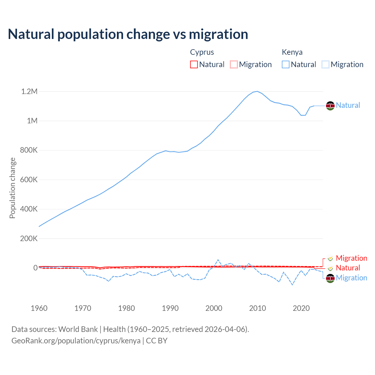 Over the last 10 years, 36.2% of the population change in Cyprus is from natural causes (a gain of 57,464 people) and 63.8% is from migration (a gain of 101,458 people). In Kenya 95.3% is from natural causes (a gain of 10,892,362 people) and 4.67% is from migration (a loss of 533,876 people).