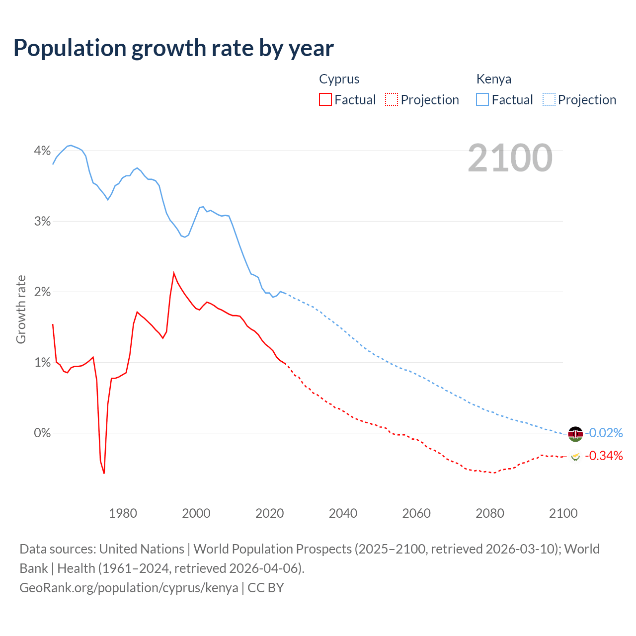 - For the last 10 years, Cyprus has had an average growth rate of +1.26% per year vs +2.08% in Kenya.