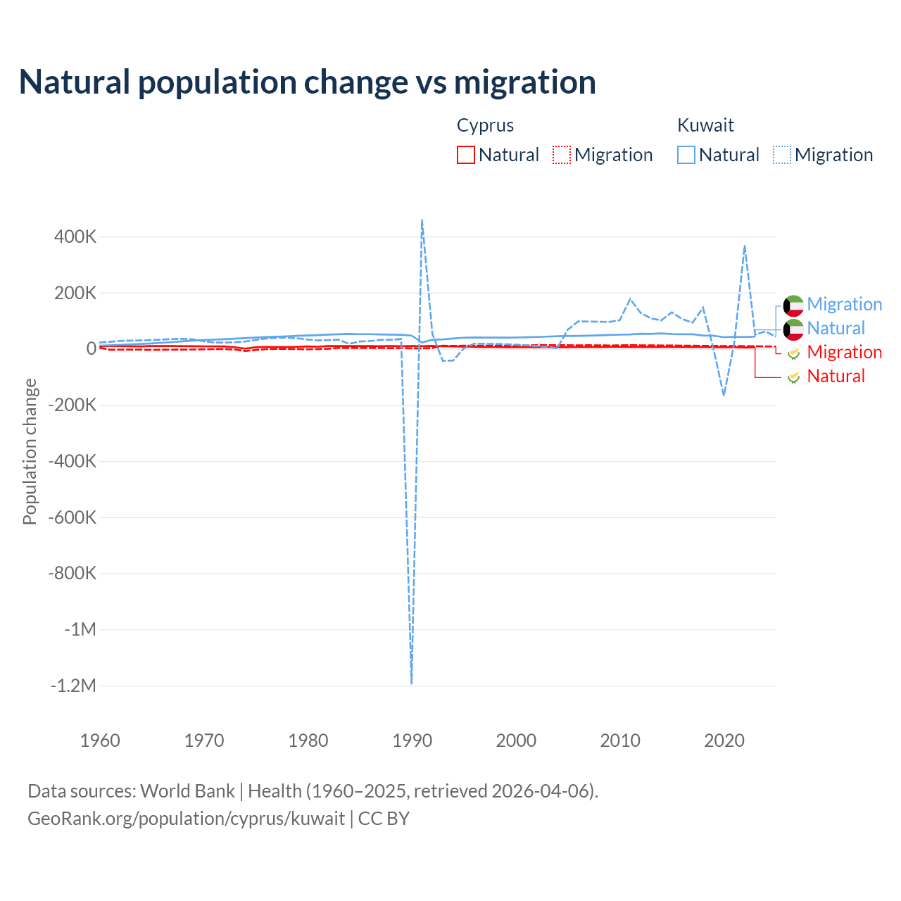 Over the last 10 years, 36.2% of the population change in Cyprus is from natural causes (a gain of 57,464 people) and 63.8% is from migration (a gain of 101,458 people). In Kuwait 35.8% is from natural causes (a gain of 470,645 people) and 64.2% is from migration (a gain of 845,142 people).