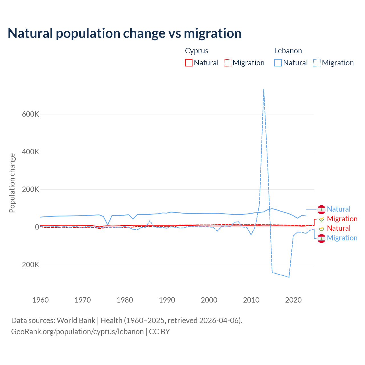 Over the last 10 years, 36.2% of the population change in Cyprus is from natural causes (a gain of 57,464 people) and 63.8% is from migration (a gain of 101,458 people). In Lebanon 40.1% is from natural causes (a gain of 739,256 people) and 59.9% is from migration (a loss of 1,103,772 people).
