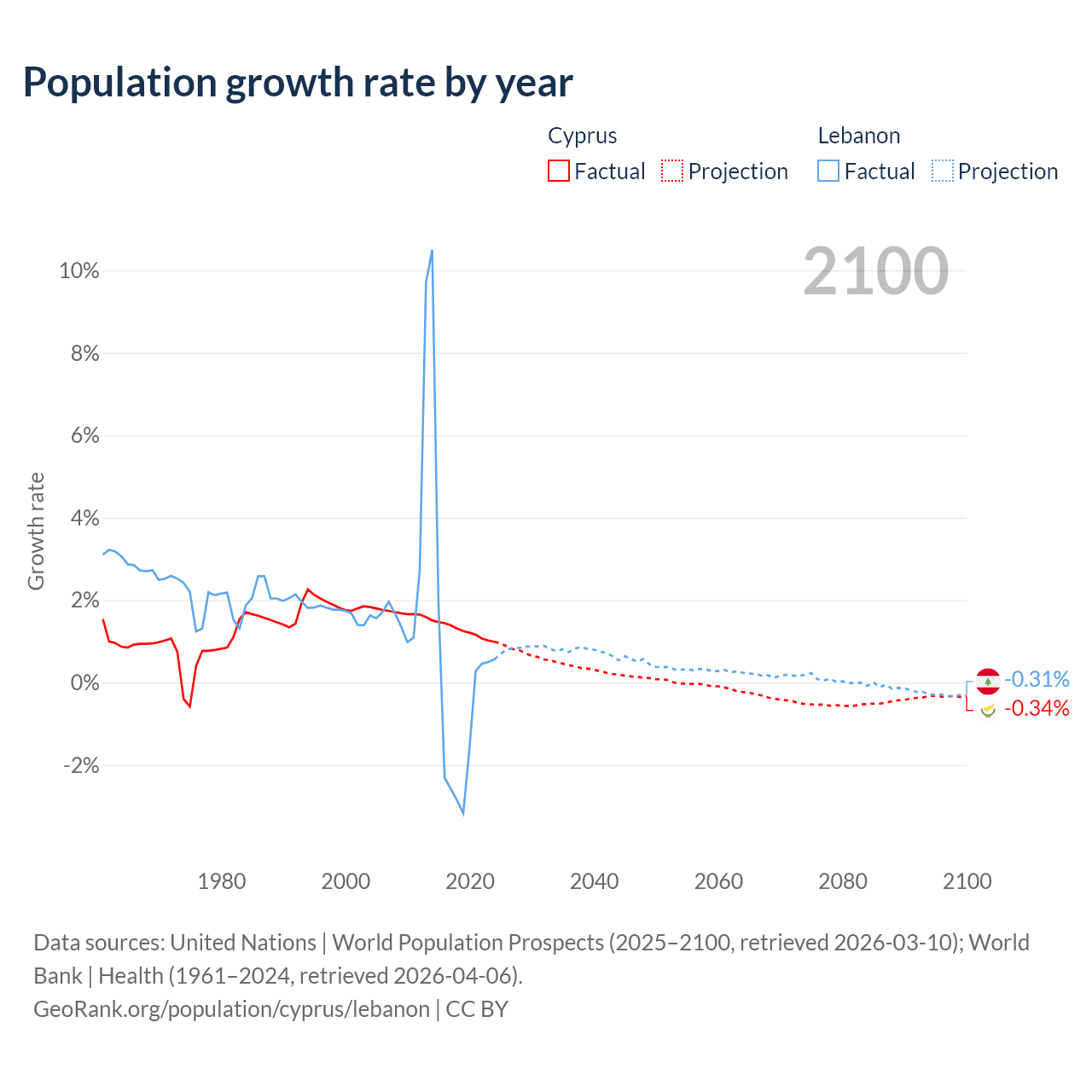 - For the last 10 years, Cyprus has had an average growth rate of +1.26% per year vs +0.16% in Lebanon.