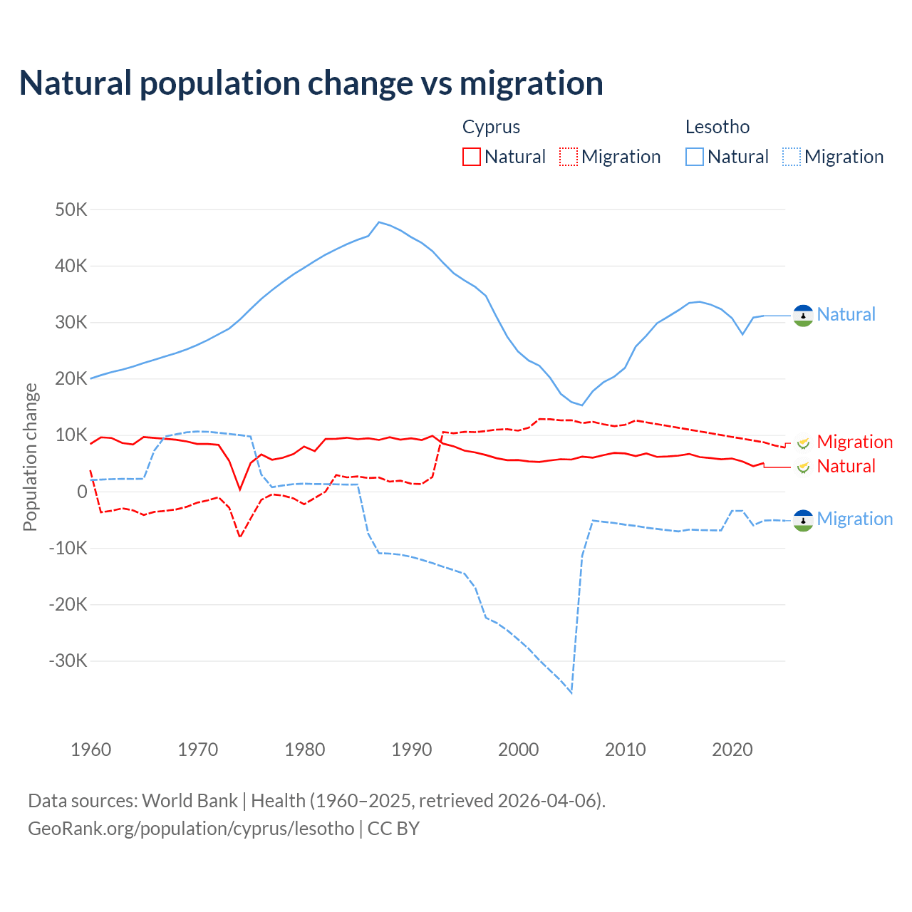 Over the last 10 years, 36.2% of the population change in Cyprus is from natural causes (a gain of 57,464 people) and 63.8% is from migration (a gain of 101,458 people). In Lesotho 84.2% is from natural causes (a gain of 315,836 people) and 15.8% is from migration (a loss of 59,457 people).