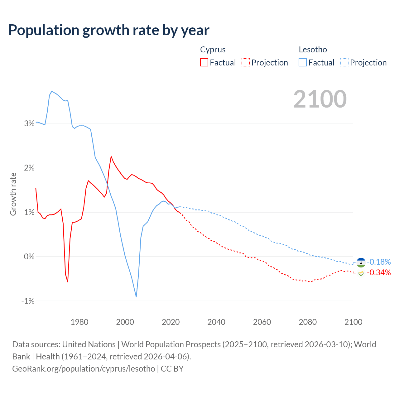 - For the last 10 years, Cyprus has had an average growth rate of +1.26% per year vs +1.17% in Lesotho.