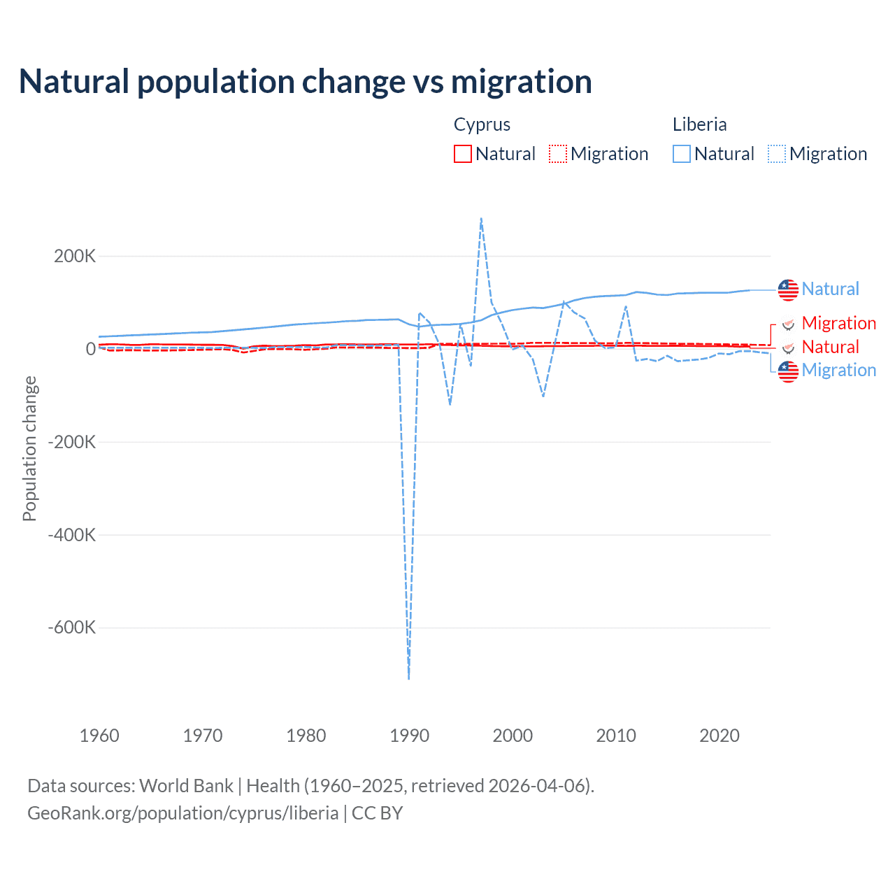 Over the last 10 years, 36.2% of the population change in Cyprus is from natural causes (a gain of 57,464 people) and 63.8% is from migration (a gain of 101,458 people). In Liberia 87.7% is from natural causes (a gain of 1,202,387 people) and 12.3% is from migration (a loss of 168,316 people).