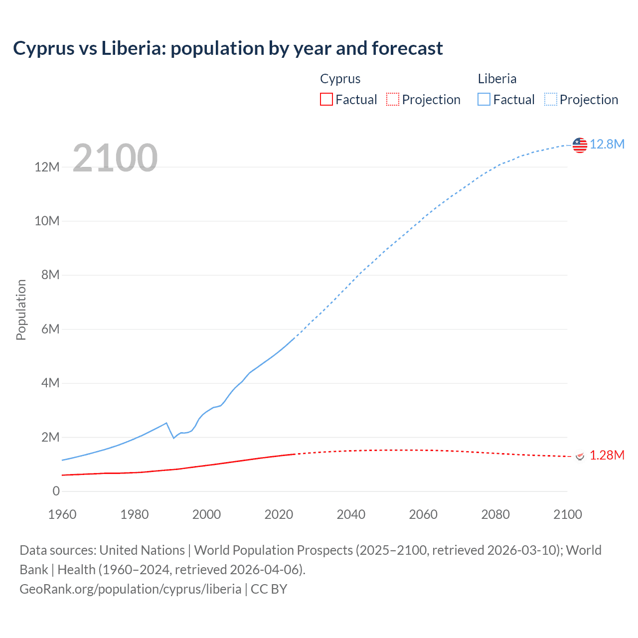 The latest officially reported population of Cyprus was 1,358,282 in 2024 vs 5,612,817 people in Liberia in 2024. In 2026, based on the adjusted UN estimation, the current Cyprus' population is 1,386,362 people compared to 5,887,000 in Liberia.