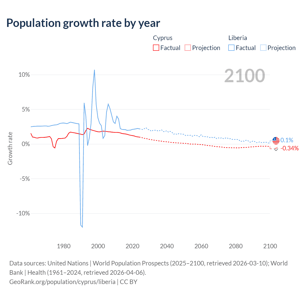 - For the last 10 years, Cyprus has had an average growth rate of +1.26% per year vs +2.09% in Liberia.