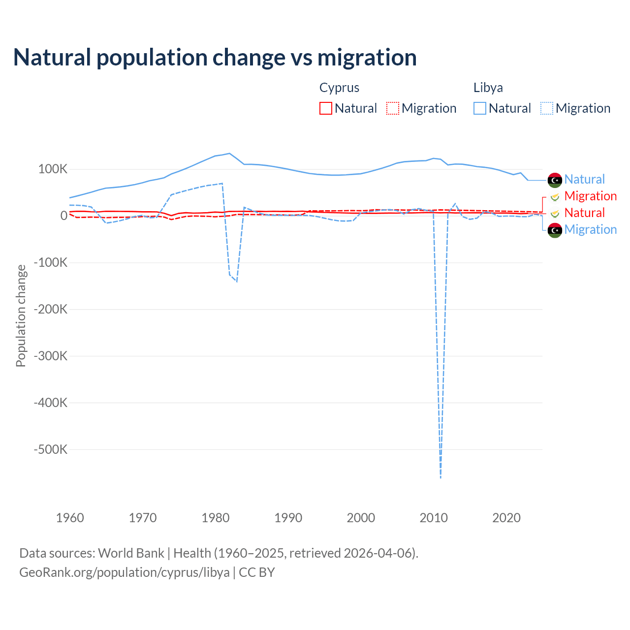 Over the last 10 years, 36.2% of the population change in Cyprus is from natural causes (a gain of 57,464 people) and 63.8% is from migration (a gain of 101,458 people). In Libya 99.4% is from natural causes (a gain of 975,799 people) and 0.63% is from migration (a loss of 6,150 people).