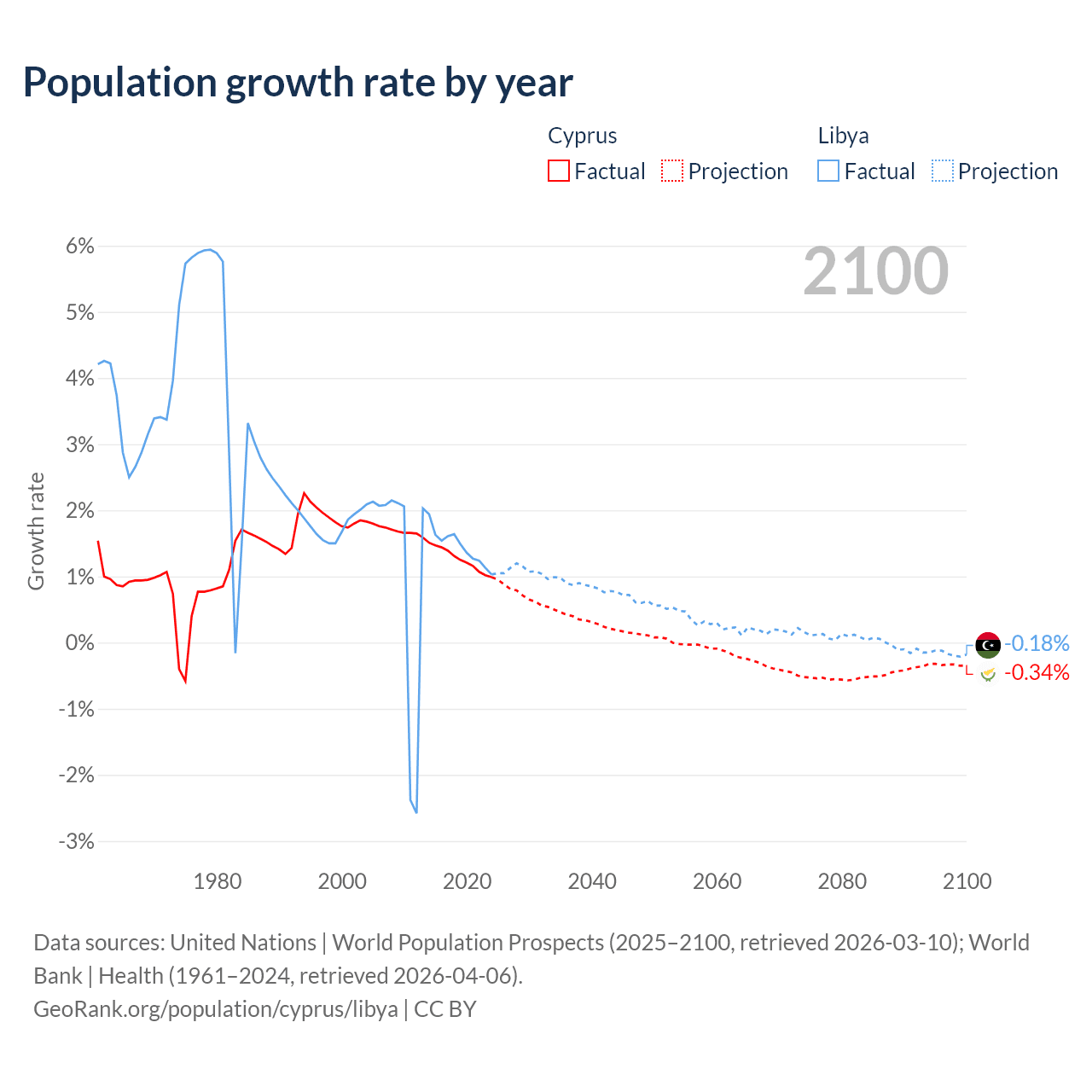 - For the last 10 years, Cyprus has had an average growth rate of +1.26% per year vs +1.44% in Libya.