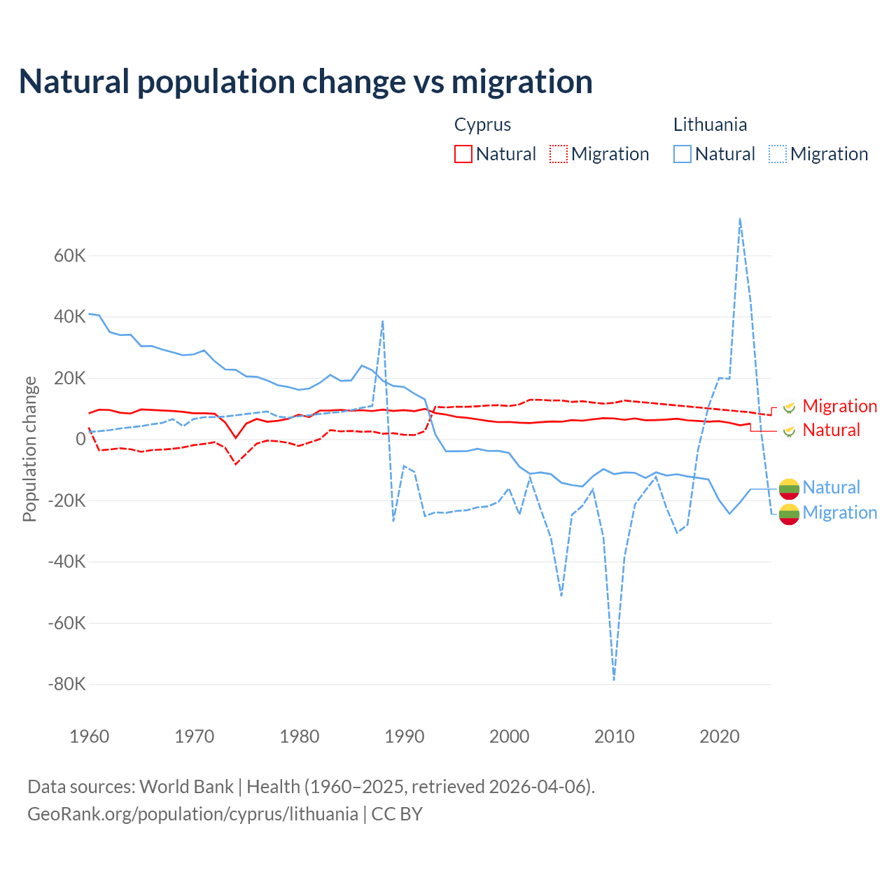 Over the last 10 years, 36.2% of the population change in Cyprus is from natural causes (a gain of 57,464 people) and 63.8% is from migration (a gain of 101,458 people). In Lithuania 68.7% is from natural causes (a loss of 153,859 people) and 31.3% is from migration (a gain of 70,196 people).