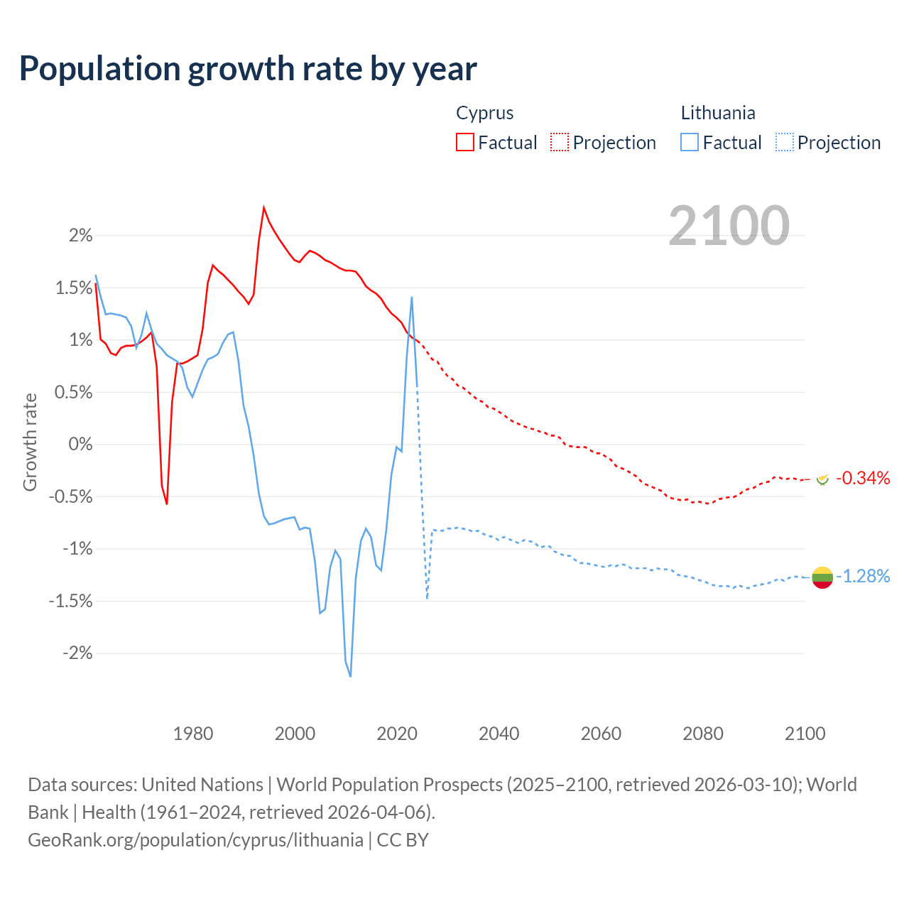 - For the last 10 years, Cyprus has had an average growth rate of +1.26% per year vs -0.22% in Lithuania.