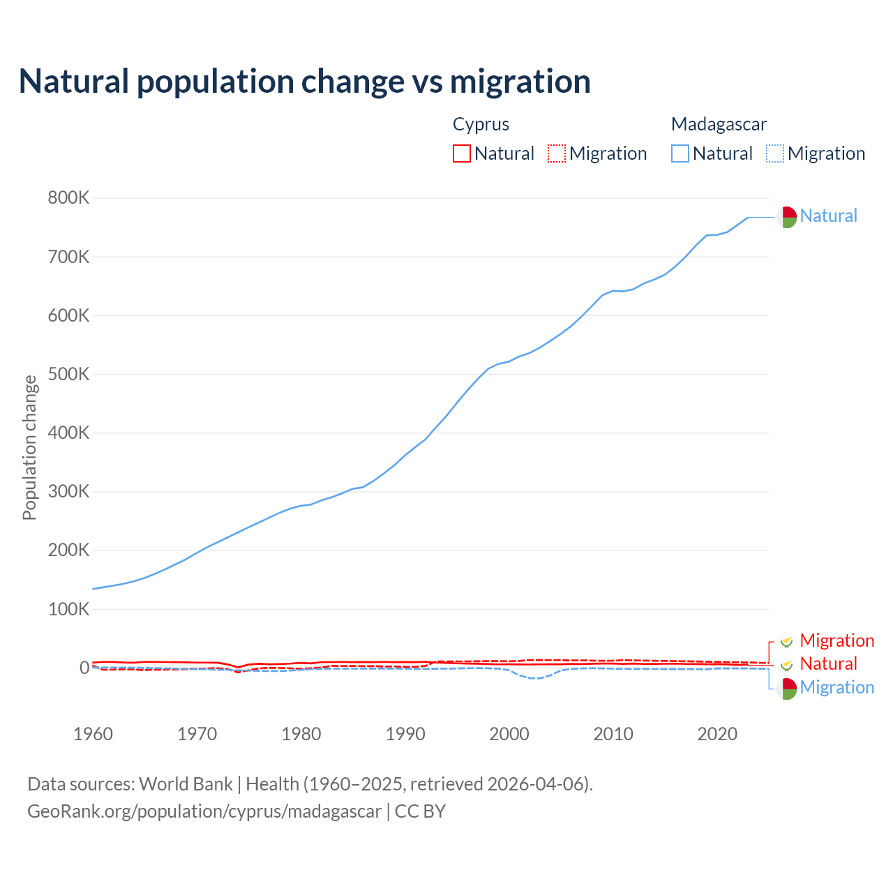 Over the last 10 years, 36.2% of the population change in Cyprus is from natural causes (a gain of 57,464 people) and 63.8% is from migration (a gain of 101,458 people). In Madagascar 99.7% is from natural causes (a gain of 7,165,578 people) and 0.31% is from migration (a loss of 22,384 people).