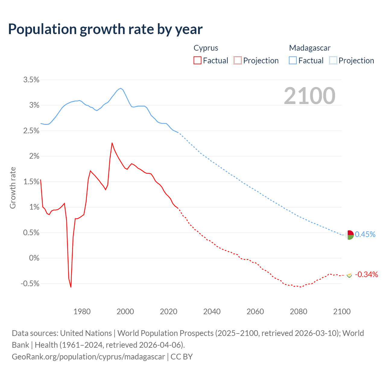 - For the last 10 years, Cyprus has had an average growth rate of +1.26% per year vs +2.6% in Madagascar.