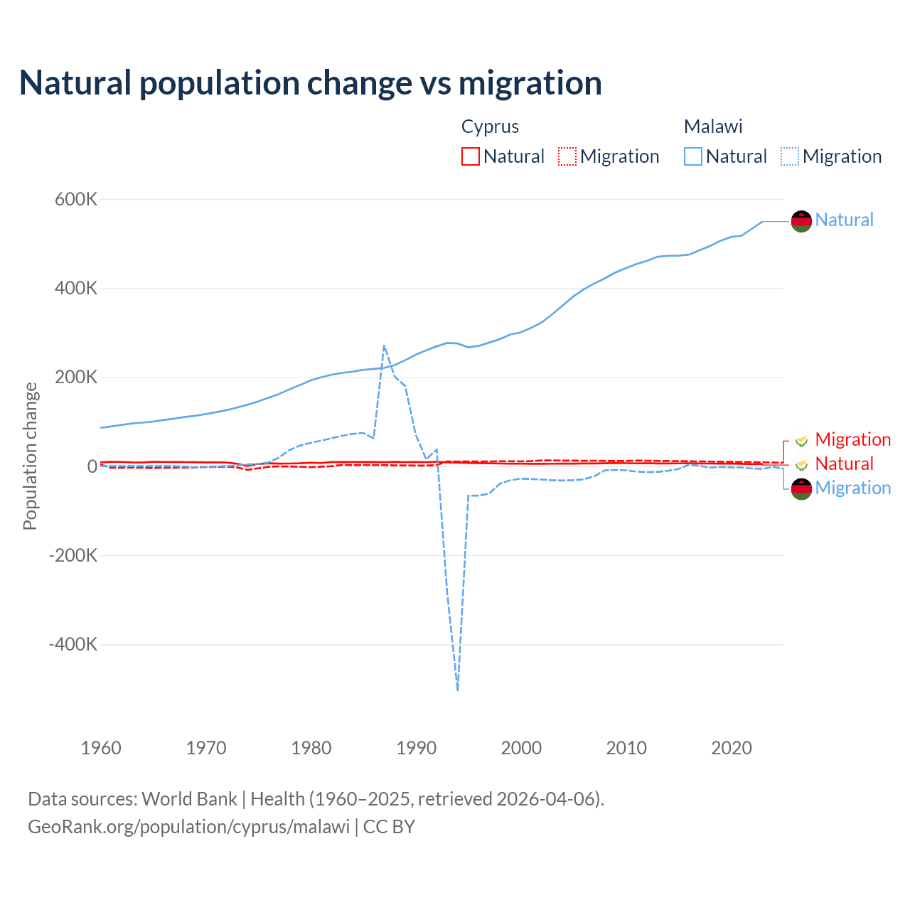 Over the last 10 years, 36.2% of the population change in Cyprus is from natural causes (a gain of 57,464 people) and 63.8% is from migration (a gain of 101,458 people). In Malawi 99.3% is from natural causes (a gain of 5,019,393 people) and 0.67% is from migration (a loss of 33,768 people).