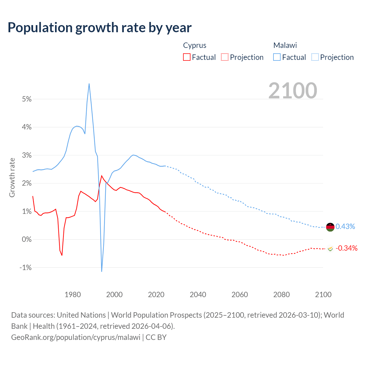 - For the last 10 years, Cyprus has had an average growth rate of +1.26% per year vs +2.7% in Malawi.
